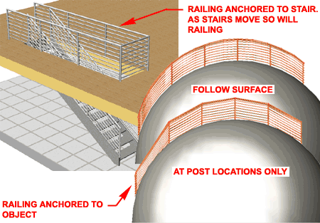 For Railings there are three primary Anchor options: RailingAnchorToStair, RailingAnchorToObject and AnchorRelease. The Anchor to Stair option is a bit unpredictable and does not have a consistent result but there are basically two results that you can expect most of the time. If a Railing tends to follow the shape of a Stair and is very close the Anchor option will usually attempt to transfer the Railing on to the Stair as if Attached to it. If the Railing is not particularly close to the Stair nor particularly similar to the Stair path, the Anchor simply sets a link between the two Objects so any Movement of the Stairs also Moves the Railings. This later option can be really handy when you have a Railing that wraps around a Stairwell. The Anchor to Object option can be rather amazing since it has an internal option to "Follow Surface" allowing such results as Railings that wind over and around a Mass Element Sphere. Note: |