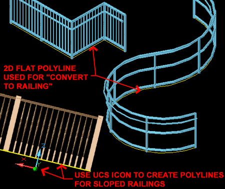 Converting a Polyline to a Railing is about as simple as it can get; just draw a regular Pline and use the Convert to Railing tool to create a Railing that follows the Pline as a path. When you use the Convert to Railing tool and select a Pline, you will be prompted to select a Railing Style. To create sloped Railings, change the UCS icon to match the slope of your intended Railing, Draw your Pline and then use the Convert to Railing tool. If you don't adjust your UCS icon, the Railing will not follow the slope because it only reads the X and Y coordinates of the object as it was drawn, relative to the coordinate plane. This means that a Pline drawn in Front view, for example, will produce a sideways Railing. |