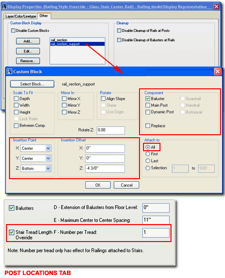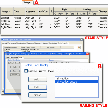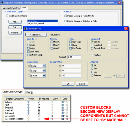 tab Depending on the Display Representation for a Railing Style, the Other tab of the Display Properties dialog may or may not offer the Cleanup options ( Model only ). The Custom Block Display section provides some of the most exciting design options for Railing Styles. For this section you have the option to Disable Custom Blocks so they don't display, Add..., Edit.. and Remove... buttons to work with Block attachments. The Add... and Edit... buttons will access the Custom Block dialog box where you can use the Select Block... button to select one block.