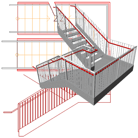 When you Add Railing and are queried to select a Stair object, the point at which you pick is use to determine the closest justification option ( Left, Center or Right ) and thus you may often end up with a Railing in the Center ( as is illustrated to the right ). If you end up with a Railing justified on the wrong side or in center, you can use the Railing Properties command to easily change the Justification - Anchors tab of Railing Properties. |