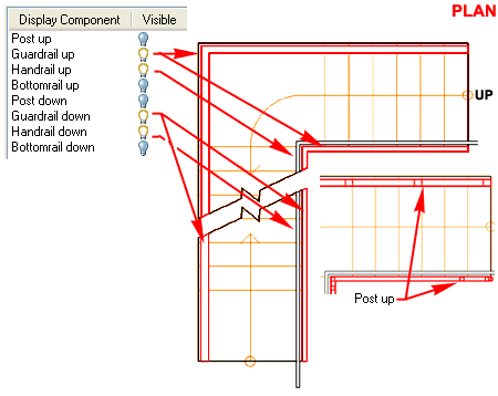 ![]() Illustrated above I show a slightly modified version of the default "Medium Detail" Display Configuration which uses the "Plan" Display Representation for most Objects. In order to illustrate how you can lighten a Handrail I changed its Display Component Color to Gray. I turned Off the Visibility of the Posts. |