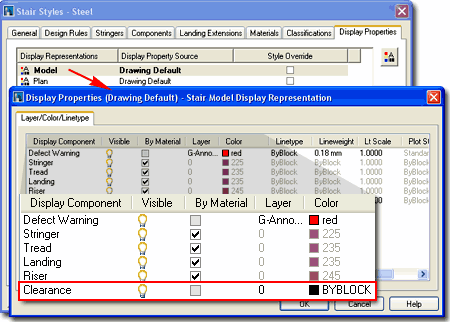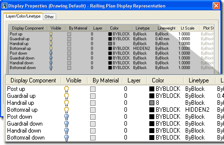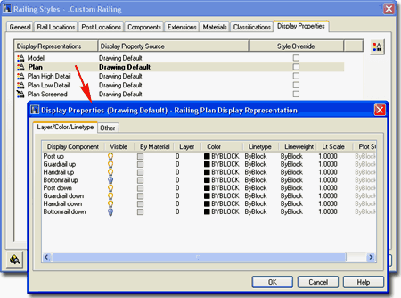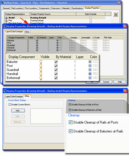 The Display Properties tab of the Railing Styles dialog box, illustrated right, provides access to the display characteristics of the components of your Railing objects; from Visibility to Custom Blocks and Cleanup Settings. This is also where you would go to have Railings change color or Materials, for example, when you switch from one Display Configuration to another. See the discussion on Railing Display Properties below for more information on this subject.