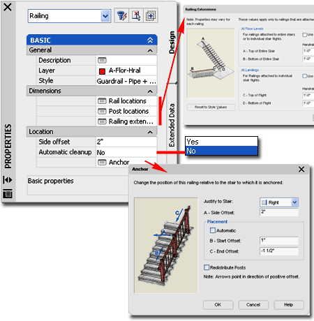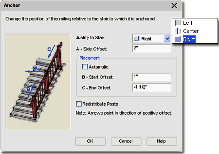| Railing Properties - Anchor tab On a Railing Attached to a Stair or Stair Flight, the Modify Properties Palette will offer access to the Anchor dialog box.. This dialog box also allows you to change the Justification of an Attached Railing, which is a great option if you simply want to move a Railing form one side of a Stair to the other. Justify to Stair - Left, Center and Right