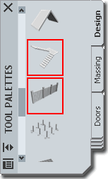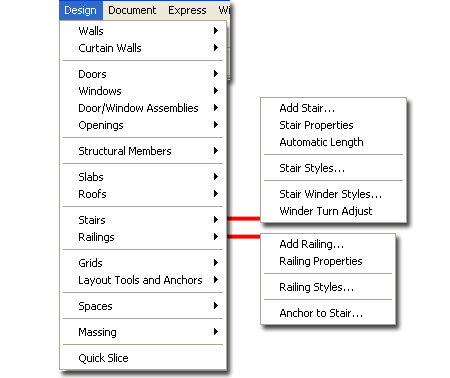 | How do I get this toolbar? You can also acquire access to some of these commands from the Alternate Design pull-down menu. From the Design pull-down menu, pick Stairs > and cascade to their respective command options - see image below, right. This toolbar is an optional tool and is not needed to use this guide but may help. |