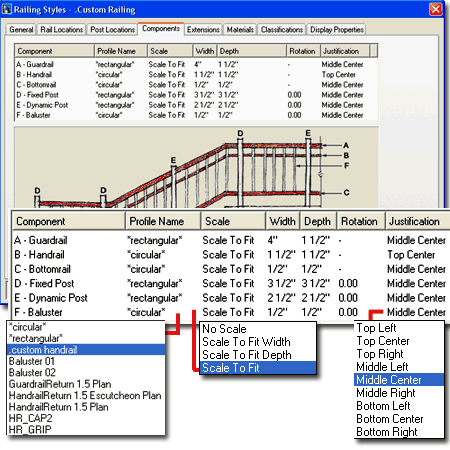 The Components tab of the Railing Style dialog box, illustrated to the right, is where you can specify the dimensional proportions of your Railing Style's Components. By default, you will find that there are two Profile Names that define two primary shapes: Rectangular and Circular. Components - this column of Components, lettered A-F is fixed. Though you cannot add Components, you can set change their shapes or set the dimensional values to zero. Custom items can be added through the Display Properties tab.