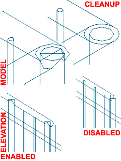 Generally, you probably will not spend much time fussing with these settings. For the Model Display Representation, you should also find that there is an "Other" tab with a Cleanup section that can be used to make Railings perform faster on your system. The Cleanup Disable feature provides an option for making the display of Railings less taxing on your system while allowing you to work in 3D without having to do something as drastic as turning Off the Visibility of specific Display Components. Illustrated to the left I show what a common Railing Style looks like in a 3D View with Cleanup Enabled and Disabled. For me, Disabling the Cleanup is find since the flaws don't show in Renderings anyway and I always Generate 2D Elevations and Sections instead of using the Live Elevations and Sections. |