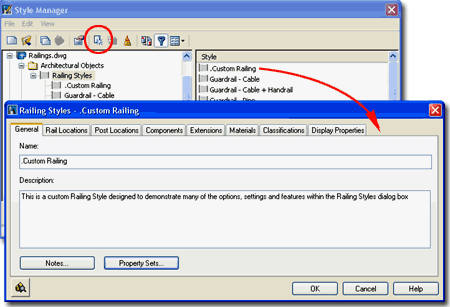 For Railing Styles, you can use the Style Manager to load, modify, delete and create new Railing Styles. Though you can easily create New Stair Styles from Scratch using the New button, you may want to use the Copy/Paste technique instead because it is far easier to Modify Settings of an existing Object Style than it is to create one from Scratch. In some cases, you may even miss specific settings that can come back to haunt you much farther down the road on a project - things like Display Representations or Data for Schedules. Illustrated to the right, I show the process of creating a New Railing Style that I have Named "Custom Railing". By double-clicking on this new style, you will invoke the Railing Styles dialogue box - as illustrated. |