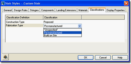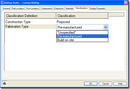 The subject of Classifications is thankfully no where near as complicated as that of Materials so the only real question you will need to consider is if you need to use them. Classifications offer another way to separate Object Styles into categories that can be used in Schedules and even in Display Representation Sets ( as "Show" or "Hide" ). Illustrated to the right I show that I have two Classification Definitions ( see Format pull-down menu), each with a list of Classification Names or Types. Generally you will not have any options on this Tab but if you have created at least one Classification Style that has been set to "Apply To" Railing Styles, you will be able to use it here. The range of use is really up to your imagination but it is fairly obvious that Classifications can be quite handy in Schedules. This topic will be discussed further under Part 18 - Schedules. You can also read a bit more about how to create Classification Definitions in Part 1 - Display. |