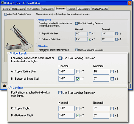 | Railing Styles - Extensions tab Allow Each Railing to Vary - this checkbox will provide access to these settings through the Properties Palette. On the Extensions tab of the Railing Properties dialog box, you should find control settings for how you want your Guardrail and Handrail Extensions relative to Stairs or Stair Flights.