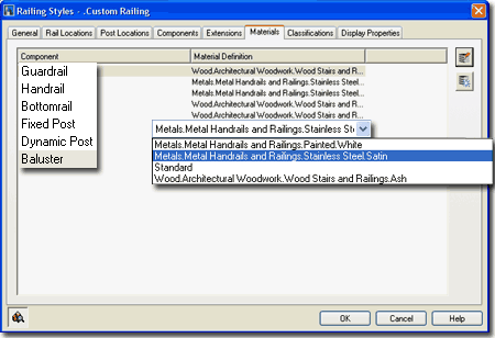 The subject of Materials is one of the most expansive and confusing topics in Architectural Desktop because it requires a complete comprehension of the product in order to take full advantage of this feature; from object styles to display representations. This subject will be discussed under Part 1 - Display and in the Presentation eGuide. Illustrated to the right I show that Railings will offer six fixed Components: Guardrail, Handrail, Bottomrail, Fixed Post, Dynamic Post and Baluster. If you create a Railing Style from scratch, the default Material Definition Name will be set to "Standard". If you have imported any of the Architectural Desktop Railing Styles from the Object Style Library, you should find that you will be able to use the Material Definitions that come with those objects - as illustrated to the right where I am selecting "Metals.Metal Handrails and Railings.Stainless Steel Satin". See also Stair Styles - Materials tab. |