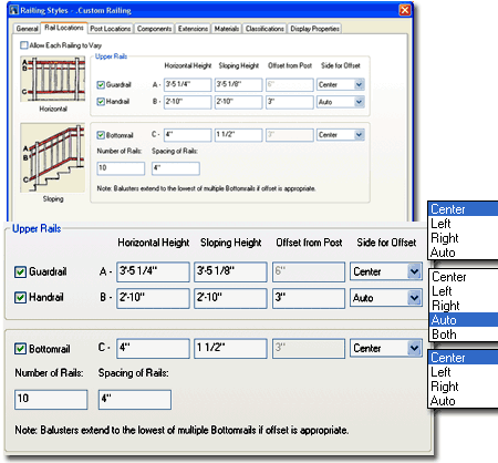 ![]() Offset - a distance measured from the justification of the railing. Railings are generally placed automatically at Center, Right or Left of Stair objects so the Offset would occur from one of those three points depending on where you pick when you select your Stair. Depending upon the Railing Style, its Anchoring position is usually through the Center of the Posts. This is why Posts often dangle halfway over the edge of Stair Edges ( an Offset of zero ). Use negative numbers to push a Railing out past a Stair's Edge and positive numbers to bring it in. Automatic - This option is only available when using the Attached To: Stair option. When set to "No", you can control the length of the Railing along the Stair Path. |