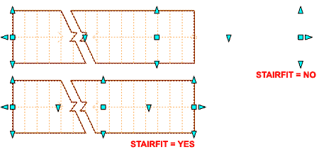 The StairFit command provides the option to Turn Off the default setting that automatically resets the Grip Points on Stairs as you make changes that affect the original Length. This is a rather odd option that you may never use. If you are experimenting with a fixed length and working with Landings at the end of your Stair Run, this might be useful since the original length will remain in place as you switch from Terminating with a Riser to Terminating with a Landing. The actual Stair Length, as measured on the Properties Palette, is not affected by this toggle. |