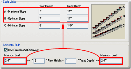 In trying to understand how to use all of these options, you may want to start by working without the Calculator Rule checked ( I highly recommend this ). Working without the Calculator Rule checked will allow you to set three or less ranges under the Code Limits and then test the results of those numbers without also having to consider what the Calculator Rule is doing. See comments in the next cell for more on this subject. Code Limits: A - Maximum Slope - the maximum slope would be defined by the greatest Riser Height you can use and the shortest Tread Depth you can use. B - Optimum Slope - the optimum slope should be set to what you would like in a best case scenario. |