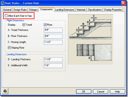 | Stair Styles - Components tab On the Components tab of the Stair Styles dialog box, you will find numerous control values for the Treads, Risers and Landing. Allow Each Stair to Vary - checking this box allows you to change these values uniquely per Stair Object by using the Worksheets section on the Properties Palette. Though allowing this freedom might seem like a great idea, it is much like allowing for overrides on the Style settings so be sure you comprehend the consequences of this option. Don't check this box while trying to learn - trust me. Flight Dimensions