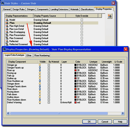 ![]() Though you are not required to use Material Definitions in Architectural Desktop, you are likely to find it difficult to avoid using them since most of the predefined Styles use them. Materials have thrown a monkey wrench into the whole Display System because they can actually take over control of how your linework appears in Plan View for Construction Documents ( discussed below under Display Properties ). The best thing to do when learning about Material Definitions is to match how most of the predefined Stair Styles have been configured; i.e., reverse engineer the ADT Styles. |