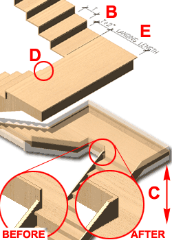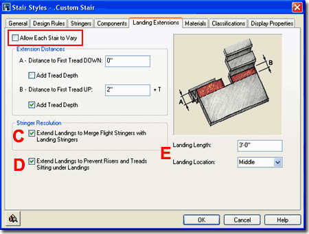 Extension Distances B - Distance to first tread UP - see comments for A - Distance to First Tread DOWN. C - Extend Landings to Merge Flight Stringers with Landing Stringers - in the illustration to the left I show an example of how this option can be a great tool to resolve Housed Stair Styles so the Landing Stringer Merges properly with the Flight Stringers. Be aware that using this option adjusts the height of the Landing in order to make this feature work. |