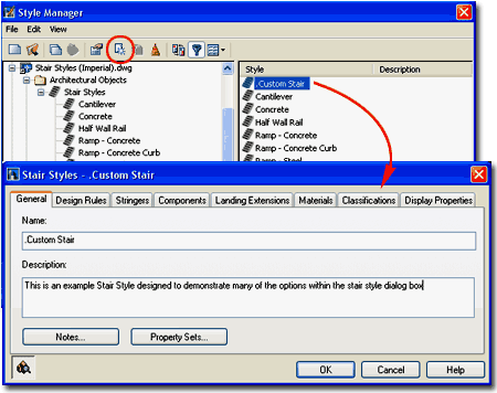 ![]() Illustrated above I show the process of creating a New Stair Slab Style that I have Named "Custom Stair". By double-clicking on this new style, I show that I have also activated the Stair Styles Properties dialog box where all of the custom settings can be made for the size, shape, rules and look of this particular object style. The General tab provides access to the Name and Description fields for a Style; plus access to the attachment of Notes and Property Sets. |