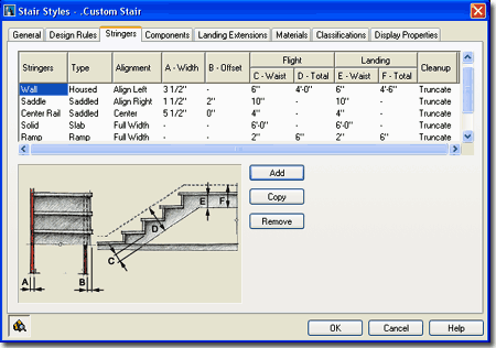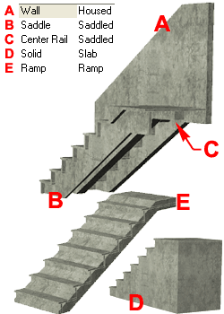 Stringers - when you use the Add button, this column acquires a new row. You can name your Stringers as you see fit. This name will appear in the Materials Component list but not as a separate Display Component under the Display Properties list. Type - for each Stringer row, you can use the Type drop-down list in the matching row cell to specify one of the four Stringer Types: Saddled, Housed, Slab or Ramp. Other options are affected or limited by the choice made here. Alignment - Saddled and Housed Stringer Types provide four Alignment options: Left, Right, Center and Full Width. Ramp and Slab Stringer Types are locked to Full Width. A - Width - for Stringers that do not have an Alignment of "Full Width", this value controls the width of the stringer. Negative values are not allowed. B - Offset - this option is only available for Stringers using the Saddled Type. Use Positive and Negative values to control the offset direction for Stringers Aligned to the Center. C - Waist - this value field is available for all Stringer Types. See graphic on dialog box for explanation of what portion of a Stringer this setting controls. Negative values are not allowed. By using extremely large values for this option, you can force the stringer to height the floor to create a completely solid solution as illustrated above left ( example "D" ). For Ramp Stringer Types, you can use the Waist and the Offset to create a Ramp under regular Stairs for such solutions as stadium seating ( example "E" ). |