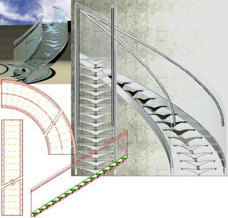 Designing Custom Stair Styles is often a matter of how you visualize your options figuratively rather than literally. In the example illustrated to the left, the solution may be more about what you don't add than what you attempt to create. In fact, this Glass Stair example only has five parts to it: the default Tread ( no Risers ) and four Stringers ( two of which are on top of each other ). The rest of the product comes from two custom Railing Styles. Before I take you through the overview of how I created this example Stair, you should know that the primary problem with Stair Styles for custom solutions is that they don't offer the option to Add... Blocks to change or Replace Components. Railing Styles, however, offer tremendous features for Adding Blocks to create your own Railing Style solutions. For the Glass Stair, I turned off the Riser and used the Stringers tab ( labeled as "A" ) on the Stair Style dialog box to create two solid metal rails at the bottom. For the Glass, I added another Stringer in the exact same location as the bottom rail but with a significantly greater height so it will act as a guardrail. Getting the look of Glass is a matter of using the Materials tab to assign a Glass Material Definition to these Components. For the Railings, I had to create two because one was for the handrail and the other was for the support structure under the Stair Treads. The handrail Railing Style is so simple to create that you can just copy one from the existing Railing Styles template file but the center support Railing Style is the most difficult part of this whole exercise. Illustrated below right, labeled as "B", I show that I have used the Add... button on the Display Properties tab of my custom center Railing Style dialog box. For this style, I used none of the default Components but created two Blocks of Components that I wanted to use instead: the center steel support tube or spine and the steel arch. One block was just a cylinder made out of a Mass Element and the other block was a Mass Element of the whole arched support system holding the glass. On the Custom Block dialog, after Adding these Blocks, I replaced the Baluster Component with the cylinder block and did the same thing with the support. Though I could have used the Post Component, I chose the Baluster because of the extra spacing options that are available on the Post Locations tab of the Railing Style dialog box. More on this later... |