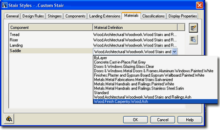 The subject of Materials is one of the most expansive and confusing topics in Architectural Desktop because it requires a complete comprehension of the product in order to take full advantage of this feature; from object styles to display representations. This subject will be discussed under Part 1 - Display and in the Presentation eGuide. Illustrated to the right I show that Stairs will offer three fixed Components ( Tread, Riser and Landing ) and as many Stringer Components as you care to Add on the Stringers tab. If you create a Stair Style from scratch, the default Material Definition Name will be set to "Standard". If you have imported any of the Architectural Desktop Stair Styles from the Object Style Library, you should find that you will be able to use the Material Definitions that come with those objects - as illustrated to the right where I am selecting "Wood.Finish.Carpentry.Wood.Ash". |