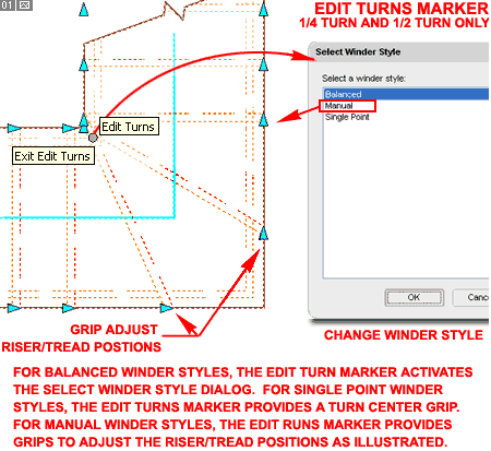 For U-Shaped and Multi-landing Stair Shapes using 1/4 or 1/2 Turn Types, you will find a unique Grip-like maker that toggles between "Edit Turns" and "Exit Edit Turns". This marker is distinguishable by looking for a gray circle near the corner at a stair turn as illustrated to the right. Two of the amazing features this icon offers is the ability to Change the Turn Centerpoint and/or Change the Riser/Tread position. Though you cannot change the Center Position and Riser/Tread positions at the same time, there are tricks to getting such results if you are careful with your Winder Style Selection. You can, for example, set a Stair to Single Point Winder Style to adjust Riser/Tread Positions and then change the Winder Style to Manual for a Centerpoint adjustment and then change the Winder Style back to Singlepoint. You can use a simple approach to achieving other results that are not possible under one particular Winder Style but be careful of the Balanced Winder Style since it can really throw a design off into the land of the unreal. For stairs using the Balanced Winder Style, the Edit Turns marker will only activate the Select Winder Style dialog which is the same option as changing the Winder Style on the Winder Style drop-down list offered on the Properties Palette. |