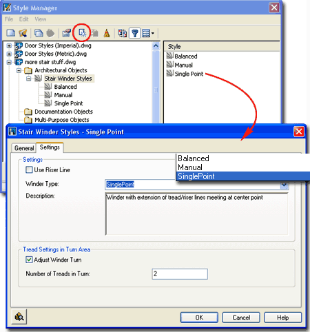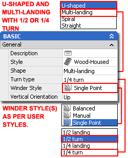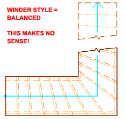 The WinderTurnAdjust command sounds straight forward when you read the command line prompt: "Select a Stair to adjust No. of Treads in Winder Turns:". However, when you attempt to use it you may find that it does not appear to do anything at all and you would be correct because this option only works when the Winder Style Settings have the "Adjust Winder Turn" checkbox checked. |