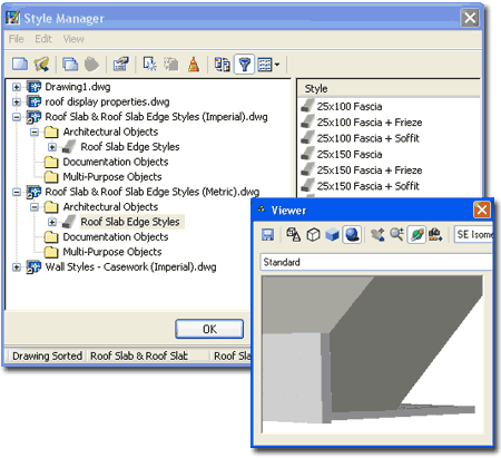 ADT comes with a short list of predefined Roof Slab Styles that you can access through the Style Manager or by using the Content Browser Window ( Architectural Desktop Design Tool Catalog... Roof Slabs and Slabs ). Much like Slabs, Roof Slabs can be quite simple and you may not need any of the predefined Styles but since you are likely to want Materials, custom Fascias, custom Soffits and unique Display Properties, you will probably want to reverse engineer these Styles to create your own permutations.