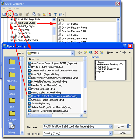 ![]() For local installations of ADT, you are likely to find the Imperial or Metric Roof Slab Styles in the Styles Folder as illustrated to the left. The full path to this location may vary but typically it is as illustrated. On a Network based installation of ADT, these Styles should be on a captured drive (like "G:\offices standards") or similar location with a folder name that indicates Styles. Consult your CAD or IT manager if you cannot locate the Styles Folder. Roof Slab & Roof Slab Edge Styles (Imperial).dwg Roof Slab & Roof Slab Edge Styles (Metric).dwg |
