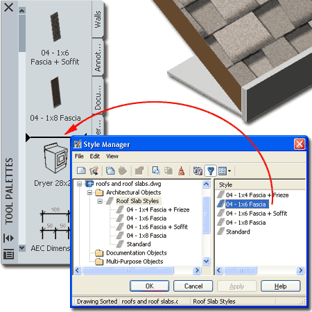 Because Roof Slab Styles can have Roof Slab Edge Styles as a Property, you will need to transfer any of the predefined Roof Slab Styles to a Tool Palette in order to take advantage of these Properties. If you don't turn the Style into a Palette Icon, you will not get the default Properties as designed for that particular Roof Slab Style. Illustrated to the right I show how you can drag-n-drop a Roof Slab Style from the Style Manager right on to any active Tool Palette. Once you have completed this process, you can right-click on the new icon and check the Properties. You should find that under the Dimensions section of the Tool Properties Palette that a Baseline edge has been set along with an Edge Style Location path to where this Edge Style is being imported from. |