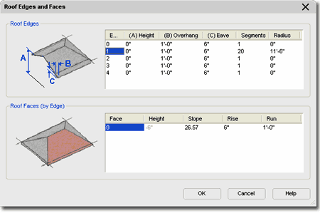 Edge - it is virtually impossible to figure out which edge is where unless you can identify it by a known slope or other value. I recommend using the Edit Roof Edges/Faces button instead. (A) Height - in typical cases, the Height matches the plate but on Gable ends, the Height is zero ( 0" ) as per the graphic on this tab. You can reverse a Gable end to a Hip by setting the Height to the true plate height and by changing the matching Face Slope to the desired slope ( something other than 90 degrees ). (B) Overhang - this is the same value as that on the Add and Modify Roof Properties Palette. (C) Eave - to access, double click on the (C) Eave column label. This deactivates the Slope option on the Roof Face since it is another way to measure slope. |