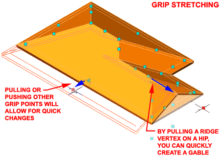 | Roof Modify using Grips Grip Editing in Plan or Isometric Views provides a very powerful method for working with Roofs. I typically do most of my Grip Editing in Isometric Views because it is easier to see the numerous Grips and their effect upon the design. Illustrated to the right I show how easy it is to take the Hip peak Grip and Stretch it out to form a Gable. When attempting this technique, make sure to have Ortho on and don't OSNAP to any other objects; simply Stretch the Grip well out beyond the edge and the transformation will occur. Another approach to Adding Roofs, is to simply let ADT take the default route by tracing or Converting the Walls and then you can |