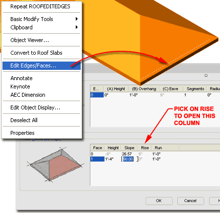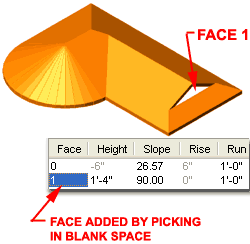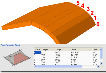 Read comments above for overview of options on this dialog box. Illustrated to the right and left I show how you can create a second face for a single slope edge by picking in the blank area under the Face column ( usually noted as 0 ). I also show that I have changed the Slope value of this new Face (noted as 1) to 90 degrees which forces it to become a gable instead of a hip. By adjusting the Height of the second Face, I have created a unique roof edge that most use Roof Slabs to create. Knowing how to change the Slope of any Face allows you to change Hips to Gables and vise-versa. |