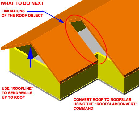 At some point in your work with Roofs, you may come to a point where you don't know what to do next. In some cases it's a simple matter of knowing the tools you have available to you and in other cases it's a matter of knowing how to attack the problem with a new object. In the illustration to the right a sample scenario where getting the Walls to come up and meet the Roof is a simple problem that can be solved with the RoofLine tool. I also show another problem that involves something the Roof Object just can't do: wrap under itself. In cases like this, it's time to Convert the Roof Object into a Roof Slab Object Auto-projecting Walls to the Roof To get Walls to automatically run up and match Roof Edges, Select one or more Wall Objects, right-click, select Roof/Floor Line and cascade over to Modify Roof Line on the object-specific pop-up menu. On the command line, use the Auto project option to make the Walls automatically read the Roof Object and project up. Command: _AecRoofLine Read more about projecting Walls under Part 3 - Walls Tools |