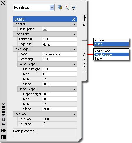 Since Roof Objects don't have Styles, you must make all of your design decisions on the Properties Palette - illustrated to the right. The good news about these options is that you can always edit them later using the same Properties Palette so don't be afraid to experiment while learning to use this object on projects. Of the set of options, the most significant is the Shape which offers three different types that can affect your Roof in very dramatic ways. For most roof conditions, I find that I start off with a Single Slope and make adjustments after getting it laid out in Plan View. You should be aware that ADT typically defaults to a Hip Roof but it is very easy to turn a Hip into a Gable after creation. Description - use this note field to add text based notes about the Roof if you find that it will help others. You could, for example, explain that the Roof slope may vary or need site confirmation. Thickness - use this value field to specify how high you want your Fascia to measure. Despite the term "thickness" this option is really not a measure of thickness but of the fascia height. Be very careful with this value since an Edge cut that is Square will produce a different roof thickness than one that has an Edge cut of Plumb. Plumb cuts produce thinner roofs in section. I make an extra effort to point out this potential problem because it caught me off guard on several occasions when mixing Roofs and Roof Slabs and I couldn't figure out why the thickness didn't match. For Roof Slabs, the term "thickness" is a true cross-sectional measurement.
