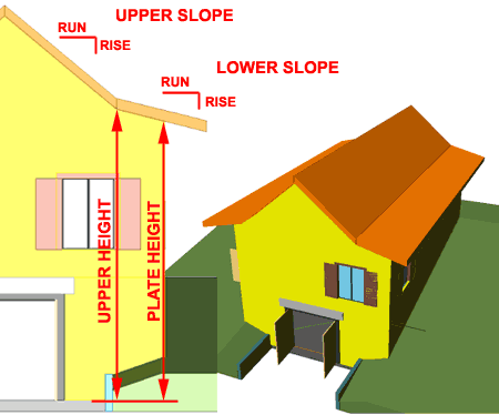 ![]() Plate Height - use this value field to specify how far above the World Coordinate Plane you want the eave of your roof to be placed. This value represents the plate which is typically measured to the inside face of stud or wall that the roof members would rest on. If you draw your roof along the exterior of your walls, the bottom of the roof will be measured to the height specified here so you can either calculate the adjusted height or draw along the inside of your walls to get a proper height. If you use the RoofConvert command and select Walls the Plate Height will automatically be calculated based on the Wall's height and the roof eave will be set to the exterior. For Upper and Lower Double Slope Roofs, the Plate Heights can be used to set the Lower Plate along the Wall and an Upper Height for the Slope Change. This means that you must use a higher Upper Height on Double Slope Roofs in order to observe any slope change. Rise - use this value field to specify the desired rise or change in height relative to the default Run value ( 12 inches for Imperial Units ). If you don't know the rise value, you can use the Slope value field instead. For Double Slope Roofs, you can use different Upper and Lower Rise values to create double sloped roof shapes. Run - always locked but serves as a unit of measure to specify a Rise against ( 12 inches for Imperial Units ). Slope - use this value field as another way of measuring the Rise / Run of a Roof based on degrees. 0 degrees can be used to create flat roofs. 90 degrees appears to cause errors and 89 degrees seems to be the current limit depending on the design of your roof.
