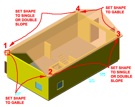 To take advantage of the Gable Shape option on the Properties Palette, you need to understand how and when to switch it on and off. In the illustration to the right, I show the process of Adding a Roof Object and where I have set the Shape to Gable and then back to Single Slope while tracing the perimeter of my building. Remember to toggle the Gable Shape Off for each roof segment that you want as a normal sloped roof. The trick therefore is to set the Shape to Gable before picking the next point to form a Gable end. Note: |