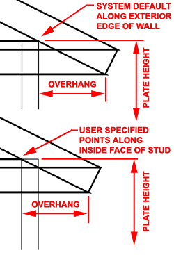 Overhang - use this value field to specify how far out you want the bottom edge of the roof to extend beyond the perimeter edge or eave. If you draw your Roofs along the inside face of stud, you will need to include the width of the walls. |