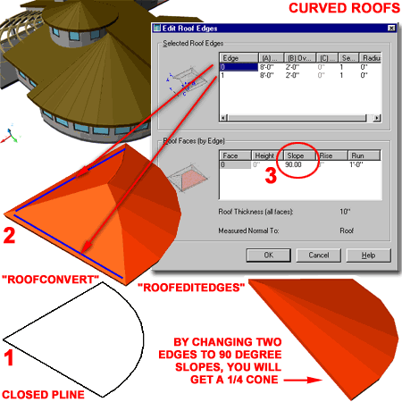 Creating Curved Roofs is actually fairly easy if you use a Closed Polyline shape as the source for conversion as illustrated to the right. If you wish to create a true cone, you can use a Polygon to convert ( not a circle ). Illustrated to the right I show a quarter cone that was created by using a quarter circle drawn as a Closed Pline. This Pline was then converted into a Roof object by using the "RoofConvert" command. In the illustration to the right, I show what happens when the conversion has been processed and since the result is not a quarter cone, I show that I had to use the Edit Roof Edges dialog box to change the slope of two sides to 90 degrees. To Edit Roof Edges, use the "RoofEditEdge" command and select the edges that do not have the correct slope ( illustrated with a blue line ). On the Edit Roof Edge dialog box, you should see a Slope option for each Edge ( see number 3, right ). Change the Slope to 90 degrees for each edge and the result should be similar to that illustrated in the lower right. Finally, you can create a more smooth curved roof by editing the curved edge and changing the Segments value on the Edit Roof Edges dialog box to a number high enough to meet your desired appearance.