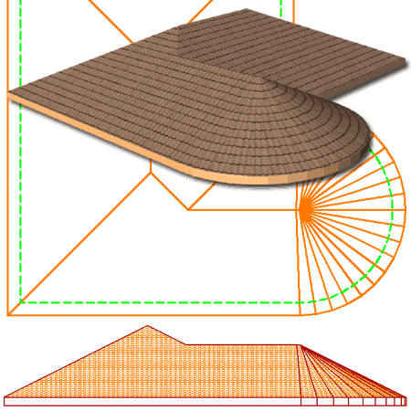 Overview If I haven't mentioned it enough already, Roof Objects don't have Styles so you only have the Display Properties to work with for display changes and you will find that there are only two Display Components to work with: Roof and Eave. Illustrated to the right I show the Plan, Elevation and Model Views of a simple Roof Object. As you can see there isn't much to work with but that is often a delight when compared to some of the more radical Objects in ADT. For the Plan Display Representation, I set the Eave Display Component to a Green Color with a Dashed Linetype to show the edge of the Walls Below. Unfortunately, you cannot turn off the radiating lines on a curved roof without affecting the rest of the roof so that may pose a problem for your CD's. The Elevation View takes advantage of the Hatch Component via the Material that you also see in the Perspective View. To prevent the Hatch and Mapped Tile Pattern from wrapping around the fascia and under the the Roof, you can set the "Surface Hatch Placement" to "Top" only.