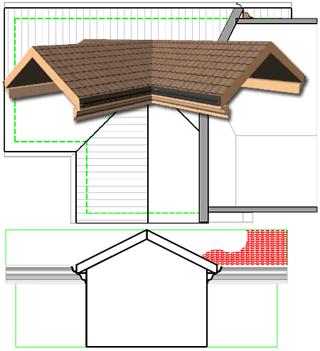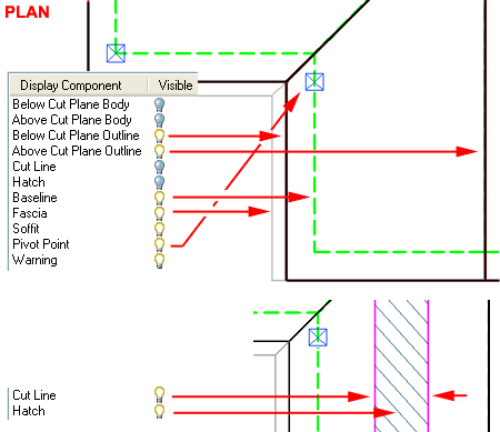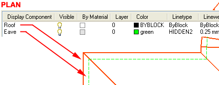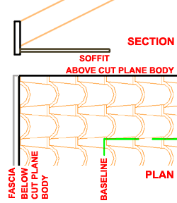 ![]() Illustrated to the right I show a slightly modified version of the default "Medium Detail" Display Configuration which uses the "Plan" Display Representation for most Objects. In order to illustrate how you can use the Baseline and Fascia Display Components, I unchecked the "By Material" option to take direct control and set the Baseline to a Green Dashed Linetype (representing an outline of Walls below) and used a thin Gray Color for the Gutter. These types of settings can also be controlled through the Material Definition but sometimes it's faster to just ignore or bypass the Materials. |