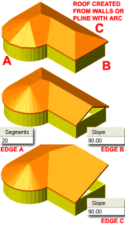 ![]() Segments - this option handles the number of segments a curved roof uses to approximate a curve. You will have more than one segment as a number and the option to change this value when having created a Roof by converting a Pline with an Arc in it. Use the RoofConvert command. Radius - this option controls the radius of roofs that have Segments in them. See comments for Segments above. Depending upon the roof design, reducing the radius may not be possible but increasing it should be possible. This value can also be controlled by using Grips. Face - there is usually a single face per Edge but on double sloped roofs, there are two Faces per Edge. By picking in the blank space below a Face value, you automatically add another Face to your Edge allowing you to make one Edge a double slope or as many varying slopes as you like. |