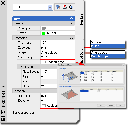 When Modifying Roof Objects, you will find that the Properties Palette is nearly identical to the Add version with the exception of four new options: Edges/Faces dialog, Rotation, Elevation and Additional information dialog. This means that you can easily start with a Single Slope Roof, for example, and use the Properties Palette at a later point in time to change it to a Double Slope. Edges/Faces - this dialog box provides the option to work on each edge and face individually with options for Height, Overhang, Eave Height, Segments and Radius as well as Slope, Rise and Run. See discussion below. Rotation - this value field provides a means for rotating a Roof Object in Plan View much like using the Rotate Command. Elevation - this value field provides the option for moving a Roof Object up or down in Elevation regardless of what the Plate Height value is set to. |