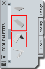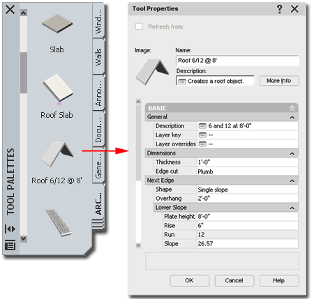 Styles Roof Objects (not Roof Slab Objects) do not have Styles so you cannot use the Style Manager to Import specific Roof Configurations. Should you want to acquire the settings applied to one Roof for a new Roof, you can use the "Match" option on the command line - see RoofAdd > Match. Illustrated to the right I show another way that you can configure Roof Objects to behave more like they have Styles. By using the Tool Palette Icons, you can Copy the Generic Roof Icon and create new ones that hold specific settings that you typically use such as Thickness, Edge cut, Overhang, Plate height, Rise and so forth. To distinguish your Roofs, you can use names that indicate what they will create and you can use the Description field to elaborate on the Name. See Tool Palettes Overview in Part i - Introduction for more information on how to work with Tool Palettes and Icons. |