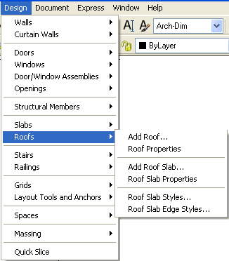 | How do I get this toolbar? You can also acquire access to some of these commands from the Alternate Design pull-down menu. From the Design pull-down menu, pick Roofs > and cascade to their respective command options - see image below, right. This toolbar is an optional tool and is not needed to use this guide but may help. |
