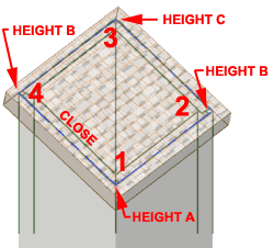 Perimeter Edge - a drop-down list offering everything discussed for option "Baseline Edge", but for all of the remaining sides. I don't like this option because it will add the Edge Style to edges you may not want and Edge Style attached to; like the ridge between two roofs. I prefer to use the Modify Properties Palette for this work. Rise - Run - Slope - you can input Rise and Run numbers that will automatically calculate an Slope angle for you or you can specify an angle. Adjustment or change in slope occurs around the Pivot Point as established upon creation of the Roof Slab or by adjustment on the Pivot Point value fields. The Pivot Point can also be modified directly on the Roof Slab Modify Properties Palette. Special Options on the Command Line: Ortho close - if used after picking a second point this button will create a rectangular roof based upon the dimension of the first two points ( basically a square with extra for soffit, etc. as per the Style ). It can also be used after a 3rd point has been picked but then the Direction options become invalid ( this is a nice quick way to finish a Roof Slab though ). The Direction of the Roof Slab will be based upon the direction established by your second picked point and the Direction buttons ( see Direction description ). If used after picking three or more points this button simply calculates what it will take to create an orthogonal closure from the last point picked relative to the first point picked. Close - only available if three or more points have been picked and simply closes a Slab shape to form a polyhedron much like Close on a Polyline. |