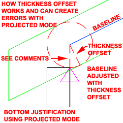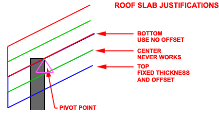 | Add Roof Slab - Justifications As stated under the Add Roof Slabs - Properties Palette, the Justification options are designed for use with the Direct Mode of adding a Roof Slab. This technique requires that you actually pick points in space that define the plane of the roof, including the slope. Though the Direct Mode method is nice at times, I don't find it to be the most common approach to creating roofs so that makes the Justification options a bit of a problem. Top, Center, Bottom and Slopeline Justifications all work as expected when using the Direct Mode to create Roof Slabs but the don't work as expected when using the Projected Mode. Illustrated to the right I show the "expected solutions" for Bottom, Center and Top Justifications and below I discuss the results you get when using these with the Projected Mode. Justifications - Projected Mode Top - does not work correctly - to get this feature to work better, you must either make manual adjustments to the Offsets or design a Roof Slab Style with a Fixed Thickness and an equal amount of Offset on the Design Rules tab of the Roof Slab Style dialog box. Center - never works correctly Bottom - works correctly when no Offset is specified on the Design Rules tab. Slopeline - works correctly both with and without Fixed Thickness and Offset values. |