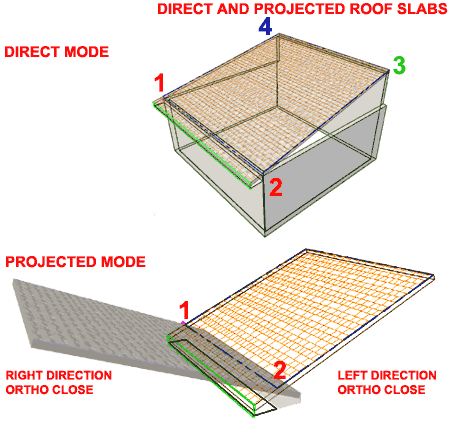 | Add Roof Slab - Direct Mode & Projected Mode When Adding Roof Slabs, you may find the Mode and Direction options a little confusing so I have illustrated the difference to the right by using the Ortho Close technique after drawing the first two points for the two example Roof Slabs.