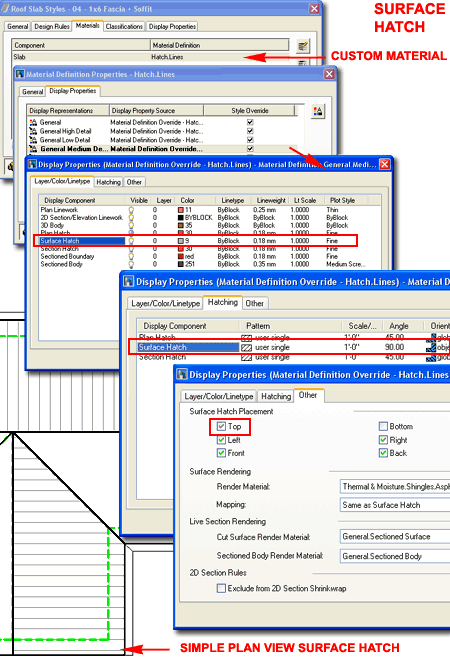 For setting and controlling Hatch Patterns on sloped Roof Slabs, you must use Material Definitions because the Hatch Display Component is for Plan View only; as in a sectional plan view. The biggest problem with Surface Hatching Roof Slabs in Plan View is that you cannot control it like you can on 2D Elevations and Sections so you basically have to accept that the patterns will fill the entire surface area of a Roof Slab ( not very attractive when using Spanish tiles or other highly ornate patterns ). The only control you have over the span of Surface Hatch Patterns is the Cut Plane and the Roof Slab Above and Below Cut Plane Body Display Components. If you attempt to use these Display Components to control your Surface Hatch, however, all you get is a linear cut off that doesn't read like a fade-off and you will see the line or lines of the cut plane since they are displayed by the Body Components. In the illustration right, I show that for the current Roof Slab Style, I have set a custom Material Definition that I named "Hatch.Lines". On the Material Definition Properties dialog box for this custom Material Definition, I show that for the current Display Representation, "General Medium Detail", I have accessed the Style Override Display Properties dialog box to confirm that the Surface Hatch Display Component is Visible on the Layer/Color/Linetype tab. On the same dialog box, under the Hatching tab, I also show that I have set a simple 'user single" Pattern for the Surface Hatch Display Component and set the Angle to 90 degrees relative to the Object. And finally, on the Other tab of the same dialog box, I show that I have confirmed that the Surface Hatch Placement is set to display for Top. Note: |