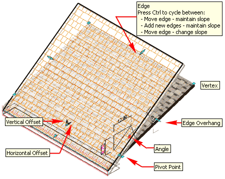 | Roof Slab Grip Points Roof Slabs have the same set of Grip Points that Slabs do. Illustrated to the right I show an Isometric View of a simple Roof Slab Object where you can see most of the numerous Grip Points. Of the set, my favorites are the Angle, Edge and Edge Overhang. For the Angle Grip, after you have selected this Grip and made it Hot ( Red ), you can use the Tab key on your Keyboard to cycle through the three options for changing the values: Rise, Run or Angle. For the Edge Overhang, make sure that you use the appropriate Grip Point since this value is the Overhang and not the Roof's Edge which has a Grip that can be in nearly the same position if no Overhang exists. For the Edge Grip, notice that you can use the Ctrl key on your Keyboard to change what this Grip actually does to your Roof Slab. After Selecting the Grip and making it Hot, you can use the Ctrl key. If you wait a second while holding the mouse still over the Grip, you will get a pop-up indicating which of the three modes you are in. The Add new edges mode, add edges to the sides so it's not quite like adding Vertex Points along the front. The Move edge and change slope mode allows you to OSNAP to other Objects, like a Ridge Line of another Roof Slab, while calculating the new slope. This is a neat feature but roofs are rarely framed by arbitrary slopes so be careful about using it. See Modify Roof Slab - Properties Palette - for information on the other Grip Points. |