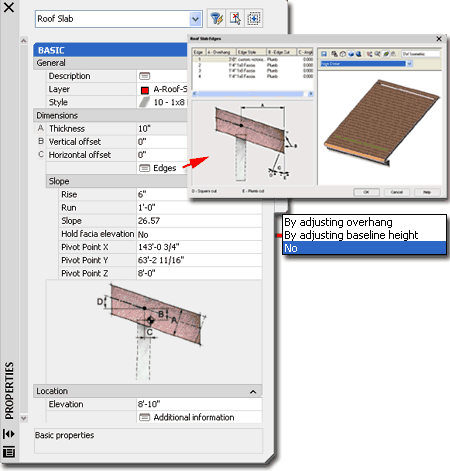 For Modifying Roof Slabs you can use the ubiquitous Properties Palette which will offer most of the same options and settings found on this Palette when Adding Roof Slabs. One of the more interesting and useful options you will find on the Properties Palette is the Edges dialog, illustrated right, which will allow you to work on each edge so you can attach things like Fascia boards, gutters and Soffit trim.